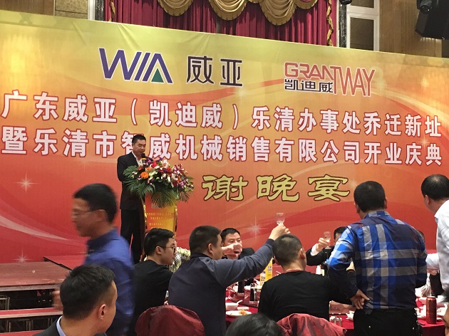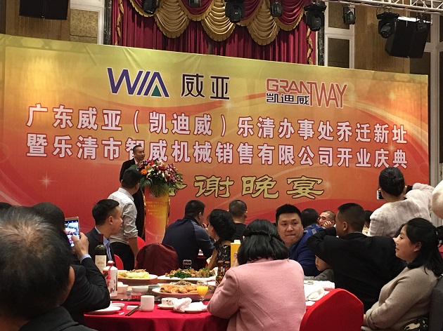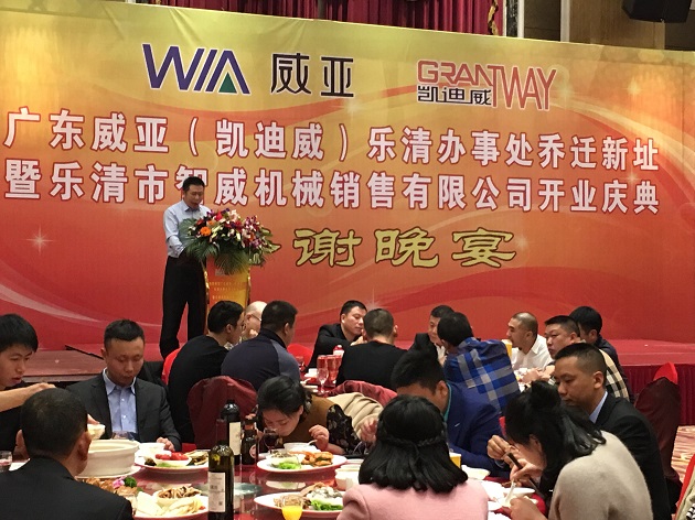 2017年1月6日,广东威亚(凯迪威)机械有限公司在乐清市柳市镇华京大酒店,简朴而隆重举行了“乐清办事处乔迁新址暨乐清市智威机械销售有限公司开业”庆典仪式。 17点48分仪式正式开始,首先,广东威亚(凯迪威)乐清办事处、乐清市智威机械销售有限公司总经理别旭辉,热情洋溢的致欢迎辞;其次,广东威亚机械有限公司总经理陈剑平对新公司的成立表示祝贺,并肯定了办事处以往的工作成绩,他表示企业的迅速发展离不开塑料配线器材行业的大力支持,也离不开所有员工的辛勤付出,搬迁新址及新公司成立是广东威亚机械有限公司新的一个里程碑,同时更是一个新的起点。